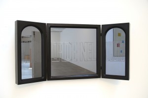 Due trittici a sportelli richiudibili, di vaga ascendenza religiosa, contengono superfici specchianti nere sulle quali sono incisi due motti apparentemente in contraddizione fra loro. L’impossibilità affermativa del primo enunciato (Nulla cade nel vuoto) sembra opporsi alla totale negazione della sua contrazione (Nulla nel vuoto). In realtà costituiscono entrambi la rivelazione della presenza dell’osservatore che si riflette nell’opera così come dell’ambiente che li contiene, a dispetto dell’abisso che astrattamente li separa. La doppia negazione dei termini proposti dall’artista risulta perciò, ontologicamente, una “riflessione” sull’opera stessa e sul significato che gli attribuisce chi la osserva. D’altra parte è l’opera a riempire di senso lo sguardo che la attraversa e di contenuto lo spazio che la ospita.