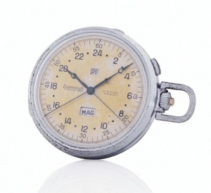 EBERHARD CRONOGRAFO RATTRAPPANTE 24 ORE, SISTEMA MAGINI DEL 1940 CA. Cassa in metallo cromato con pulsante in corona e rettangolare al 4, secondo pulsante al 16 per rimessa rapida del mese (discreto). Quadrante ruotato di 15° argentato con 24 ore smaltate e divisione a 60 minuti/secondi, finestrelle per giorno al 12 e data al 24 (originale, patinato, buono). Movimento n. 1109 a carica manuale (ottimo). Quadrante e cassa firmati.