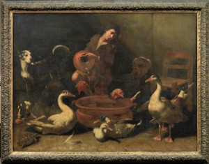 GIOVANE CHE VERSA LACQUA IN UN BACILE CIRCONDATO DA ANATRE, TACCHINI, UN CANE, UN CONIGLIO E UNA TARTARUGA