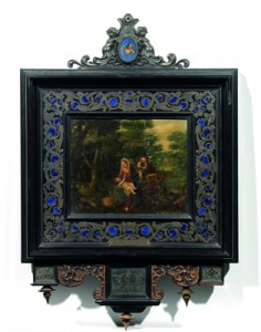 RIPOSO DURANTE LA FUGA IN EGITTO IN UN PAESAGGIO BOSCHIVO olio su rame, cm 16,5×20 entro importante cornice listrata in ebano con intarsi in argento e lapislazzulo a volute fogliate, sormontata da un coronamento in argento con putti alati. Al centro medaglione con angiolettodipinto su lapislazzuolo. Nella parte inferiore pendaglina sagomata probabilmente di epoca antecedente alla cornice, con inserti in metallo dorato e argento, decorati a smalti policromi. Al centro placchetta in argento inciso con api probabilmente della famiglia Barberini e tracce di smalti policromi.