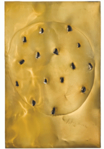 Cinque Fontana nella lista dei top ten. Primo posto sul podio con il “Concetto Spaziale”, squarci e graffito su ottone, opera datata 1964-65 della rara serie dei Metalli che ha più che raddoppiato la stima in catalogo dopo una gara tra cinque collezionisti durata alcuni minuti (è stato aggiudicato a € 1,184,750). L’opera è stata premiata anche per la sua assoluta rarità: sono infatti solo 9 gli ottoni realizzati dal grande maestro dello Spazialismo.