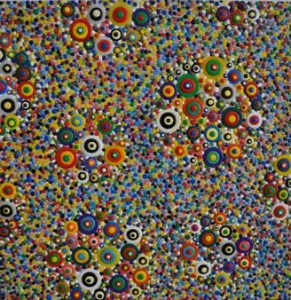 Davide Nido, allievo e assistente di Aldo Mondino, dal maestro ha ereditato il gusto per i calembour linguistici, l’utilizzo di materiali ‘impropri’, l’amore per i colori puri. E, non ultima, la tendenza a dipingere lontano da schemi codificati. Grazie alla particolare texture puntinata ottenuta con l’uso di colla termofusibile che l’artista “spara” con l’apposita pistola direttamente sul supporto, la tecnica di Davide Nido possiede il dono di un’esclusività tale da diventare marchio distintivo. È un lavoro lento e di estrema precisione, dove non sono ammessi errori, pena la perdita del quadro. L’esito è un’impressione di volta in volta diversa che può evocare un tessuto molecolare al microscopio, i pixel di un’immagine televisiva, una stoffa messicana, un paesaggio lunare, bollicine, la stringa di un codice informatizzato. Non è comunque prioritario né calcolato. Si sciolgano i punti e si otterranno ragnatele, fluide, dinamiche. Punti e ragnatele si dispongono sulla tela in uno spazio potenzialmente illimitato, conseguendo un effetto di inconsueta suggestione plastica e tattile, soprattutto nei monocromi in cui l’insita componente scultorea viene ulteriormente esaltata. Tanto che le opere di Nido inducono a essere toccate, manipolate.