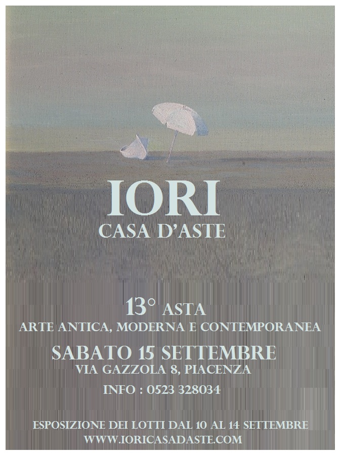 Si terrà sabato 15 settembre 2012 la 13esima asta di arti antiche, moderne e contemporanee presso la Iori Casa d’Aste in via Gazzola 8 a Piacenza. Saranno 3 tornate importanti, dalle 10.00 del mattino fino alle 19.00, nelle quali saranno battuti circa 200 lotti meritevoli di attenzioni.