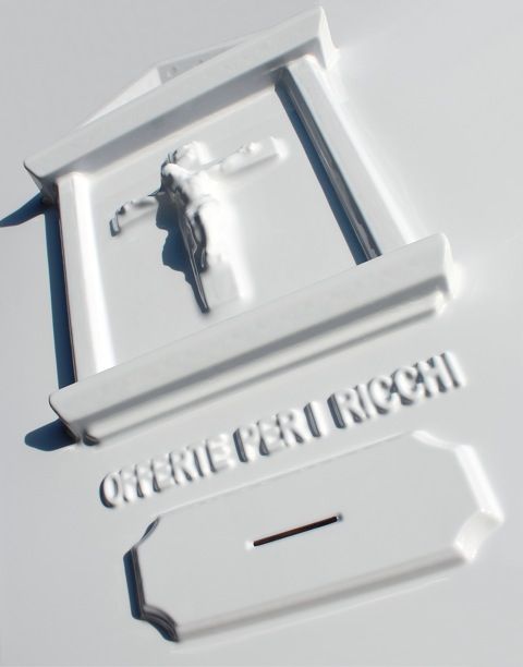 Per questa esposizione Sabatini Odoardi ha creato una serie di opere inedite tra le quali un’installazione che sarà posizionata sul grande Mosaico romano, il ciclo provocatorio degli Offertori che prendono spunto dalla vicina città di Assisi, due video, l’opera presentata all’ultima Biennale di Venezia dal titolo: Senza titolo + cubo con rumore segreto, una grande installazione a pavimento con giostra nera rotante, l’opera dei dodici inginocchiatoi bianchi con gamepad Senza Titolo in wireless, l’opera Cuccia con ciotola, le lapidi Senza titolo 2007, la Coca-santiera Senza titolo 2010. Poi ci sarà il suo Bicchiere con alcuni disegni su poliestere e tutte opere trattate attraverso la tecnica principale dell’artista ovvero la Termoformatura in polistirene.
