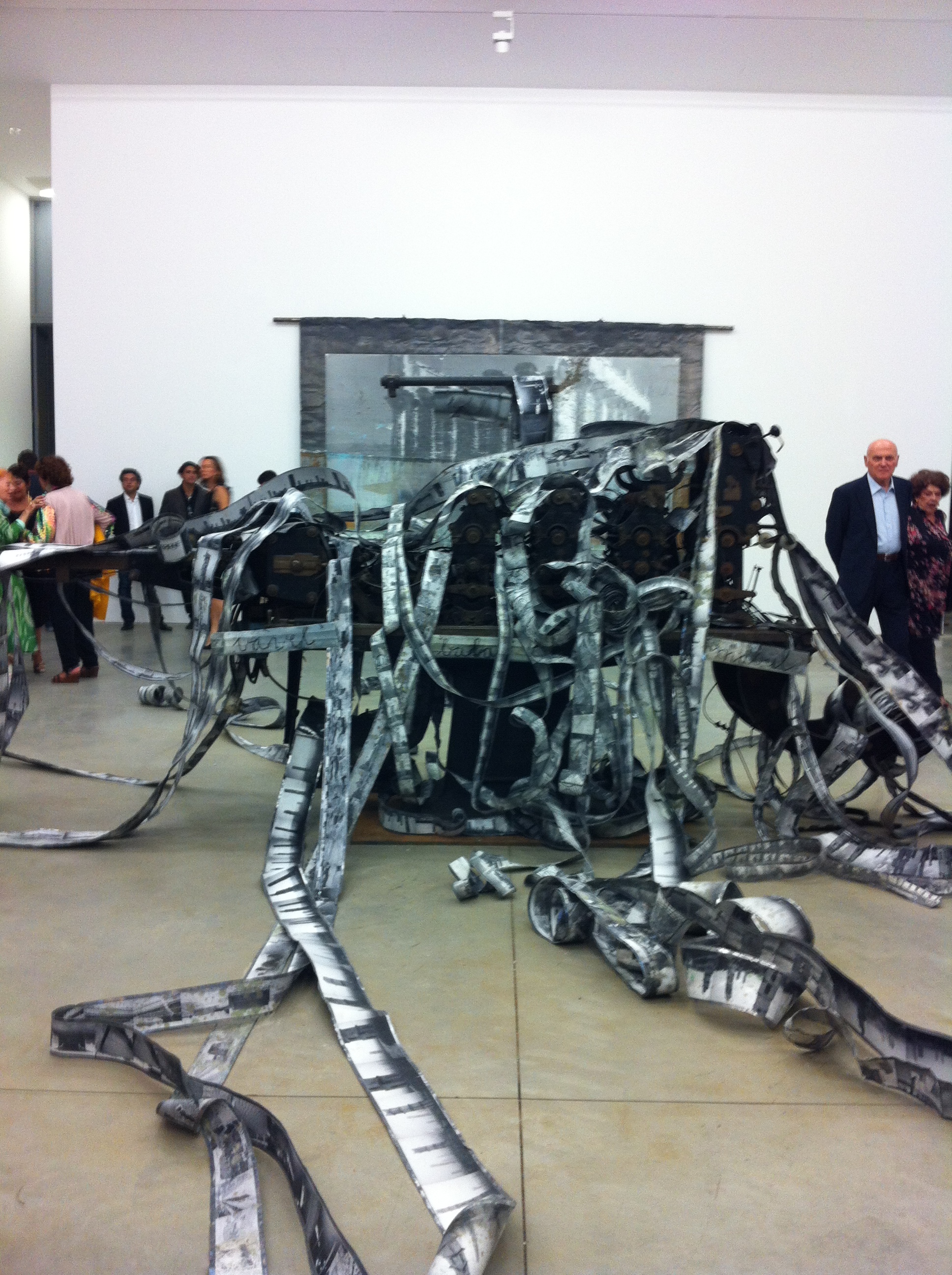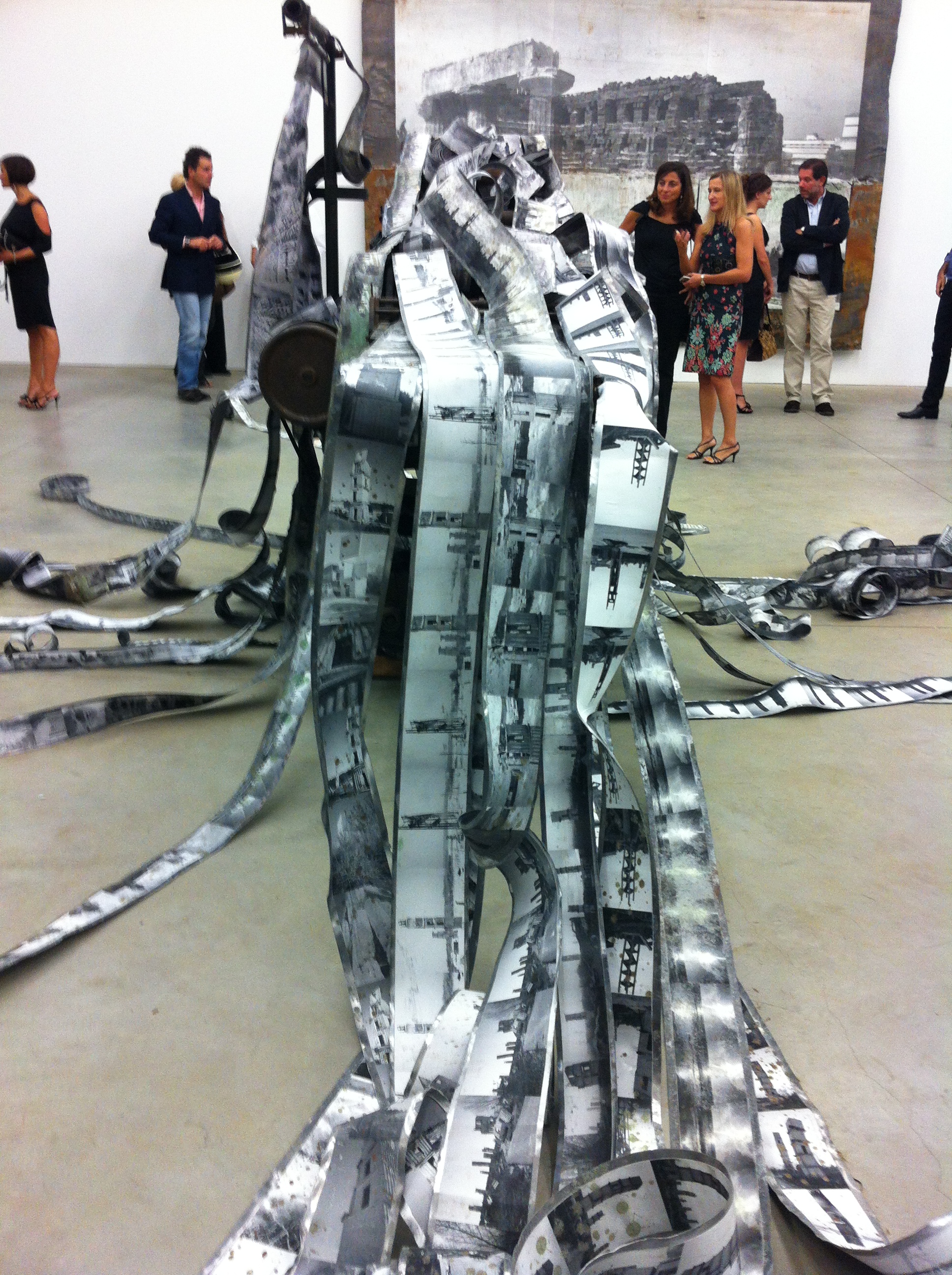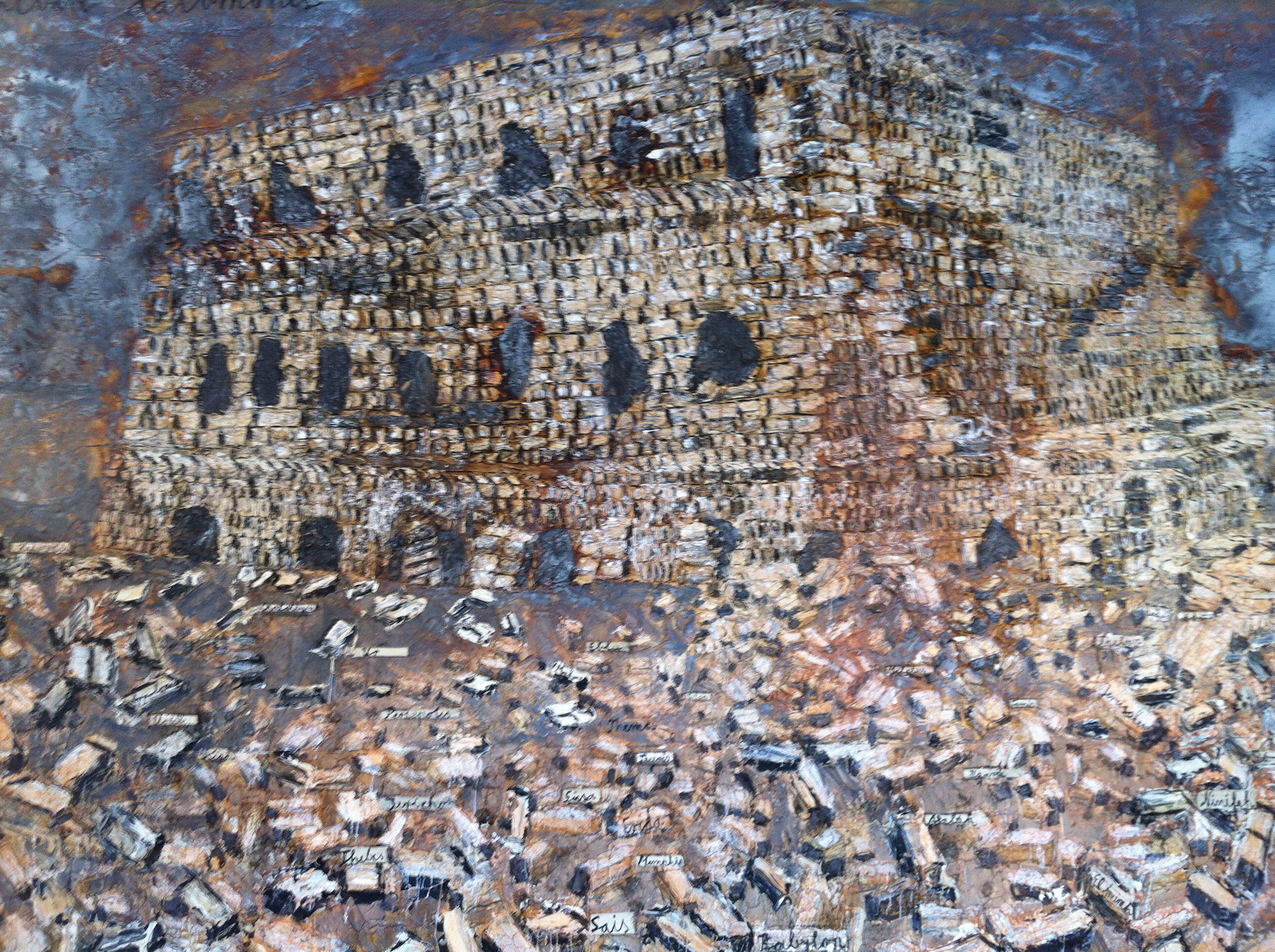 A padroneggiare in mezzo alla sala d’ingresso della galleria anche l’opera “Bavel Balal Mabul”, sempre del 2012, circondata da quegli antichi templi immortalati senza più colore. Una vecchia macchina tipografca dalla quale fuoriescono lingue di piombo che si diramano per tutto lo spazio circostante (attenti a non calpestarle) con immagini di torri e di costruzioni impresse in quelle strisce inquietanti che sembrano dei tentacoli pronti ad avvinghiarci. Un richiamo alla Torre di Babele del Libro della Genesi. E’ il caos, la dispersione di ogni punto di riferimento, tra la confusione delle lingue e il diluvio. Un monito, in realtà, per cercare di iniziare a comunicare uno con l’altro, facendo tesoro delle differenze.