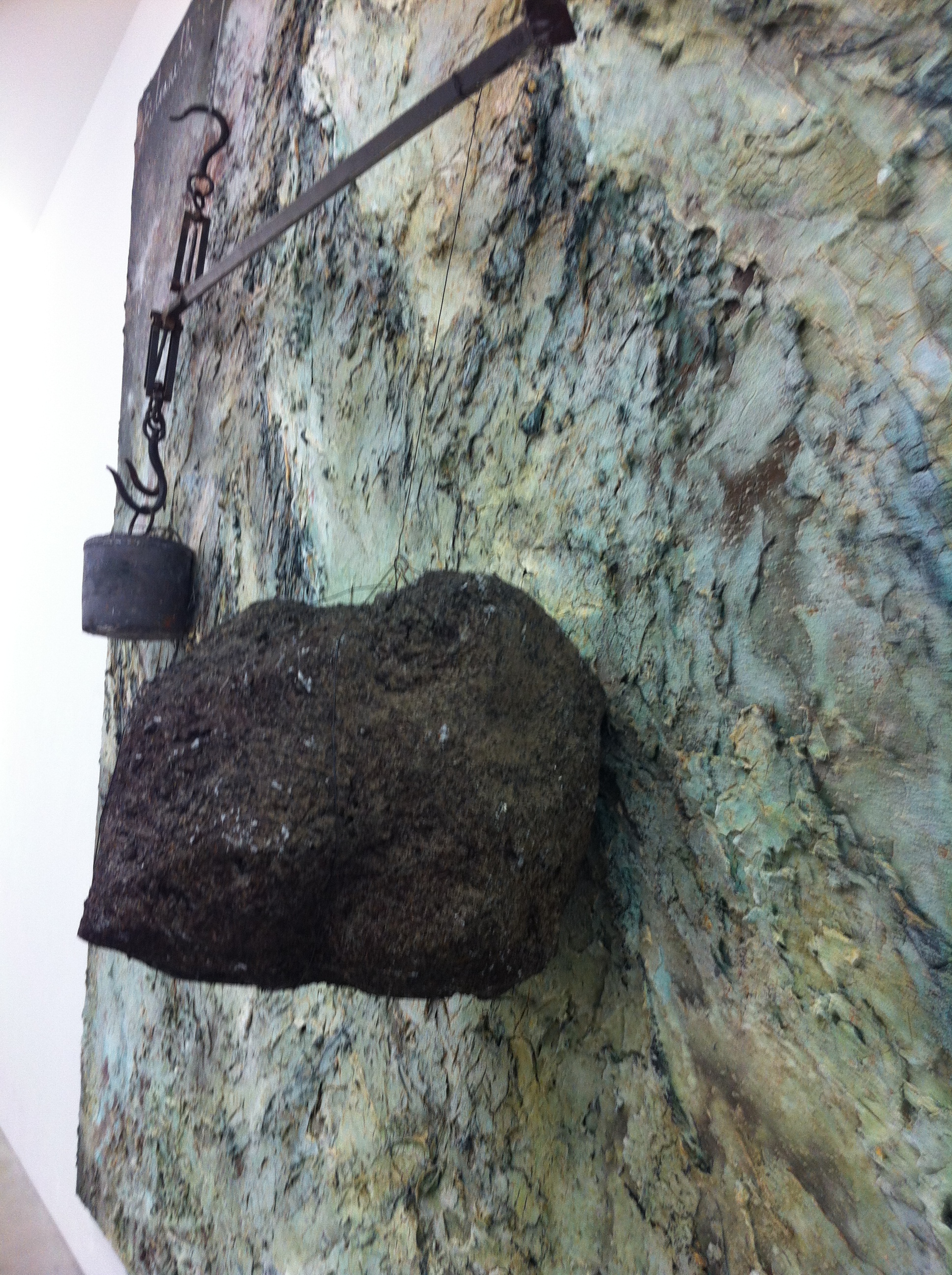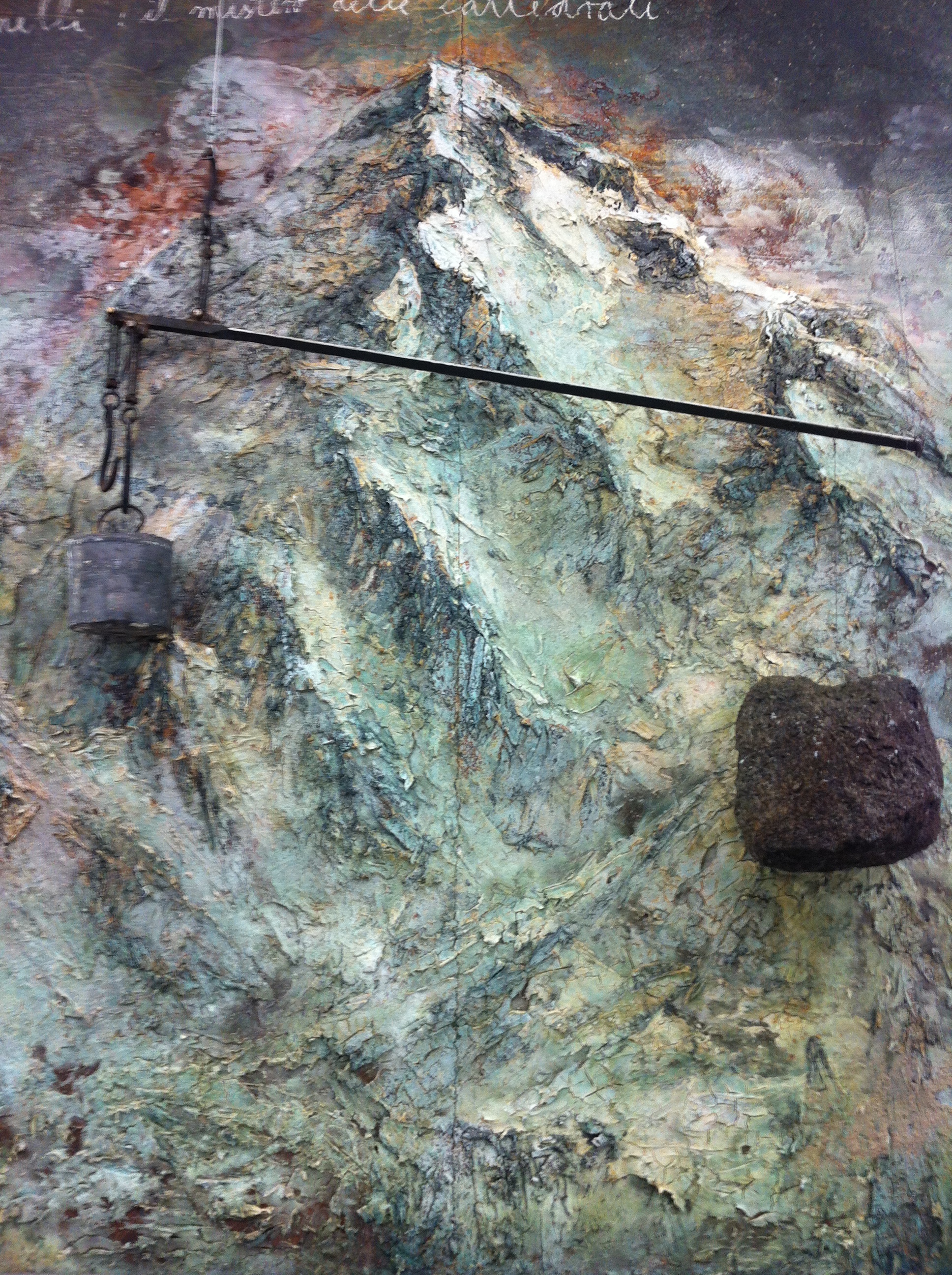 E’ la volta del secondo piano e dell’opera “Fulcanelli: il mistero delle cattedrali”, sempre datata 2012, olio, acrilico, pastello, acciaio, piombo e intonaco di gesso. Una montagna come forza spirituale che svetta in uno scenario tenebroso con appeso un bilanciere e una pietra. Il quadro questa volta si ispira e celebra la sfuggente figura di Fulcanelli, autore nel 1926 di uno testi chiave dell’interpretazione della Grande Opera. Presenti in questo piano anche dei libri fotografici di Anselm Kiefer sempre datati 2012, con immagini di ruderi e templi ormai distrutti che si ergono da una terra arida e quasi dimenticata, culla della conoscenza e tesoro inestimabile dei tempi d’oro di un uomo che aveva ancora tutte le carte in regola per essere chiamato con questo termine. Uomo.