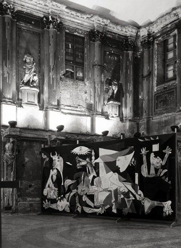 Il tetto prese fuoco e venne giù tutto, le cariatidi violentate assistettero in silenzio al disincanto, per due anni la sala rimase scoperta scalfita da degrado e intemperie e il dramma rieccheggia da allora. Qui simbolicamente Picasso volle testimoniare gli orrori della guerra e la sua intrinseca distruzione. Qui fino a poco tempo fa son usciti dall’oblio polveroso delle cantine di Galleria Marconi i funerali dell’anarchico Pinelli di Baj. Ispirati a chi se non a Guernica?