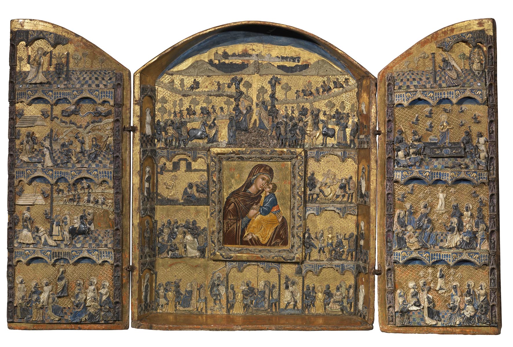 18/09/2012 – La Galleria Moretti Fine Art ha venduto il pezzo forte dello stand già durante il Vernissage della Biennale des Antiquaires (giovedì 13 settembre) al Grand Palais di Parigi. Si tratta di un trittico devozionale composto da pannelli della fine del 15° inizio 16° secolo (56 x 89.5 cm aperto) con al centro una icona di 16 x 12.6 cm. E’ stato acquistato da un collezionista europeo, un nuovo cliente (prezzo richiesto € 900.000). Al centro è rappresentata la Vergine con il Bambino, mentre nei due sportelli laterali e intorno all’icona sono rappresentate le storie della vita e della passione di Cristo in quindici episodi.