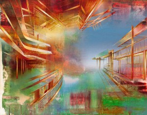 Dystown raccoglie i frutti degli ultimi due anni di lavoro dell’artista. La produzione di Martin Kobe, caratterizzata da un’ossessione feconda per l’architettura, è influenzata dalle immagini della propria collezione di disegni di architettura, dalle fotografie di viaggio e da una miriade di rimandi storico-artistici da Piranesi alla Bauhaus. Ne risultano rappresentazioni visionarie e senza tempo, in bilico tra realtà e finzione, che alludono ad un luogo o un edificio senza però lasciare segni di riconoscimento definibili. I colori forti e artificiosi e la luce netta che irradia le superfici interrompono la razionalità della composizione, suggerendo una lettura differente dell’opera riconducibile ad un dipinto espressionista ed astratto. Lo spettatore è invitato ad entrare nello spazio fisico ed emozionale del dipinto, in un labirinto di facciate sospese e travi convergenti.