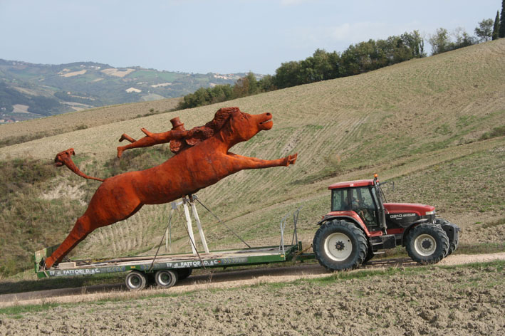 Posizionata su uno dei crinali prossimi a Urbino, all’interno della Tenuta, la monumentale scultura di Calcagnini, raffigurante un imponente cavallo che salta il mondo, si vede svettare verso il cielo, in posizione dominante su tutta la vallata del Foglia ed è una piacevole sorpresa per chi percorre in ambo i sensi l’adiacente Strada Provinciale di Montefabbri.