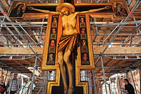 Il grande Cristo Crocifisso in legno dipinto, che misura 475 x 395 cm, fu realizzato intorno al 1320 dal Maestro di Figline. E’ collocato nella parte superiore dell’abside della basilica di Santa Croce a Firenze. L’opera, rovinata dagli offuscamenti del colore, da graffi sulla superficie pittorica e con il supporto ligneo minacciato dalle infestazioni di insetti, e’ stata sottoposta ad un accurato intervento di ripulitura e consolidamento, portato avanti a partire dal 2009. A finanziare il lavoro, con 163 mila euro, è stata la fondazione Friends of Florence. Il restauro del Crocifisso, collocato a molti metri di altezza, è stato effettuato sfruttando le impalcature montate dai tecnici dell’Opificio delle pietre dure per effettuare interventi di recupero, tuttora in corso, sugli affreschi che decorano l’abside della basilica.
