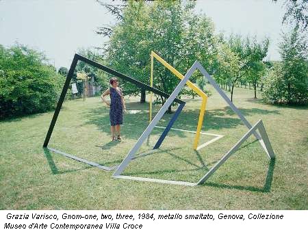 All’ingresso della mostra, la grande scultura Gnom-One-Two-Three-Four divide l’intero ambiente in due parti: a destra di chi entra, una serie di lavori recenti giocati sul rapporto (trasgredito) fra cornice e superficie, dove di quest’ultima viene negata perfino l’integrità (i Quadri Comunicanti e le Risonanze). A sinistra invece si apre la parte più fedele alla cronologia della ricerca della Varisco.