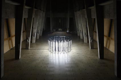 Con Blanc, blanc, blanc il duo francese interviene direttamente sui muri del silos dell’ex Pastificio, applicando uno strato di vernice bianca industriale che contiene dei microgranuli di vetro. “Più di cinquant’anni dopo i Vuoti di Yves Klein – spiegano Berger&Berger – questo wall painting interroga di nuovo la nozione di white cube. Per contrasto con il bianco iniziale conservato sul muro e sul pavimento, il nostro bianco “personalizzato” rappresenta una superficie di riflessione e di diffusione della luce artificiale della galleria”. In questo modo i muri funzionano come uno schermo cinematografico, che restituisce l’essenza della luce proiettata nella direzione di arrivo e non come uno specchio nella direzione simmetrica, in rapporto alla perpendicolarità della superficie riflettente.