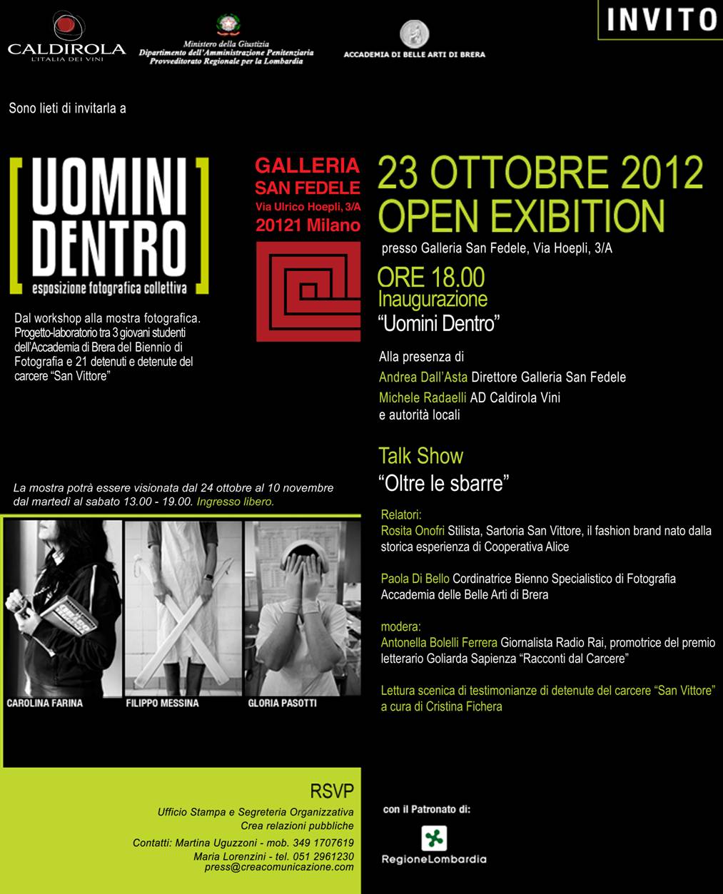 Milano, 8 ottobre 2012 – Gli “Uomini Dentro” si rimettono in gioco: dopo gli ottimi riscontri della prima edizione, sta per prendere il via la seconda tappa della mostra fotografica itinerante, promossa e sostenuta da Caldirola Vini, in co-progettazione con la Direzione della Casa Circondariale Milano, il C.T.P. Cavalieri di Milano e l’Accademia delle Belle Arti di Brera – Biennio Specialistico di Fotografia.