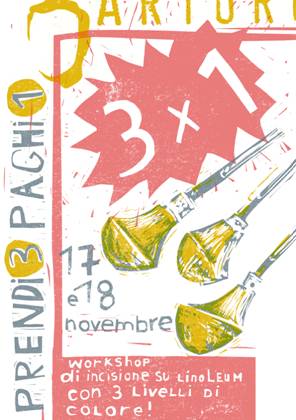Due giorni di workshop per sperimentare la tecnica dell’incisione su linoleum. Questa volta a 3 livelli di colore, 3 colori, 3 matrici, 3 passaggi sotto il torchio.