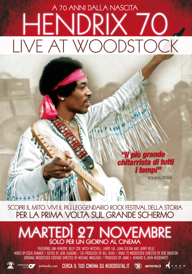 Per questo -in occasione di un altro importante anniversario, quello del 27 novembre, che vedrebbe Hendrix compiere i suoi 70 anni- Nexo Digital è orgogliosa di annunciare l’arrivo nelle sale italiane (elenco a breve disponibile su www.nexodigital.it) di HENDRIX 70. LIVE AT WOODSTOCK, il film che vede protagonista colui che nel 2011 la rivista ROLLING STONE ha eletto a furor di popolo come “il più grande chitarrista di tutti i tempi” davanti ad Eric Clapton e Jimmy Page (Led Zeppelin). Jimi Hendrix arriva così al cinema proprio il 27 novembre in uno dei suoi concerti più celebrati, quello avvenuto all’alba del 19 agosto 1969 al Festival di Woodstock. Un documento di straordinaria importanza raccolto durante il concerto che più di ogni altro ha segnato l’immaginario di un’intera generazione. Hendrix 70 –Live at Woodstock è un’opera impreziosita da un lavoro di restauro effettuato sul master audio che finalmente potrà essere apprezzato in audio surround 5.1 di qualità superiore, con un nuovo mix curato espressamente da Eddie Kramer, sound engineer di Woodstock e per diversi anni fonico di fiducia dello stesso Hendrix.