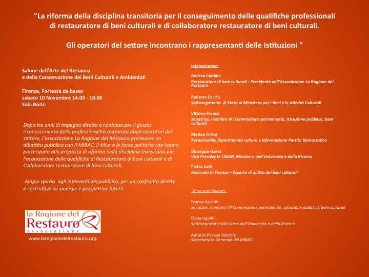 Dopo tre anni di impegno diretto e continuo per il giusto riconoscimento della professionalità maturata dagli operatori del settore, l’Associazione la Ragione del Restauro promuove un incontro pubblico con il MiBAC, Miur e le forze politiche che hanno portato avanti le istanze di riforma della disciplina transitoria per l’acquisizione delle qualifiche di Restauratore di beni culturali e di Collaboratore restauratore di beni culturali.