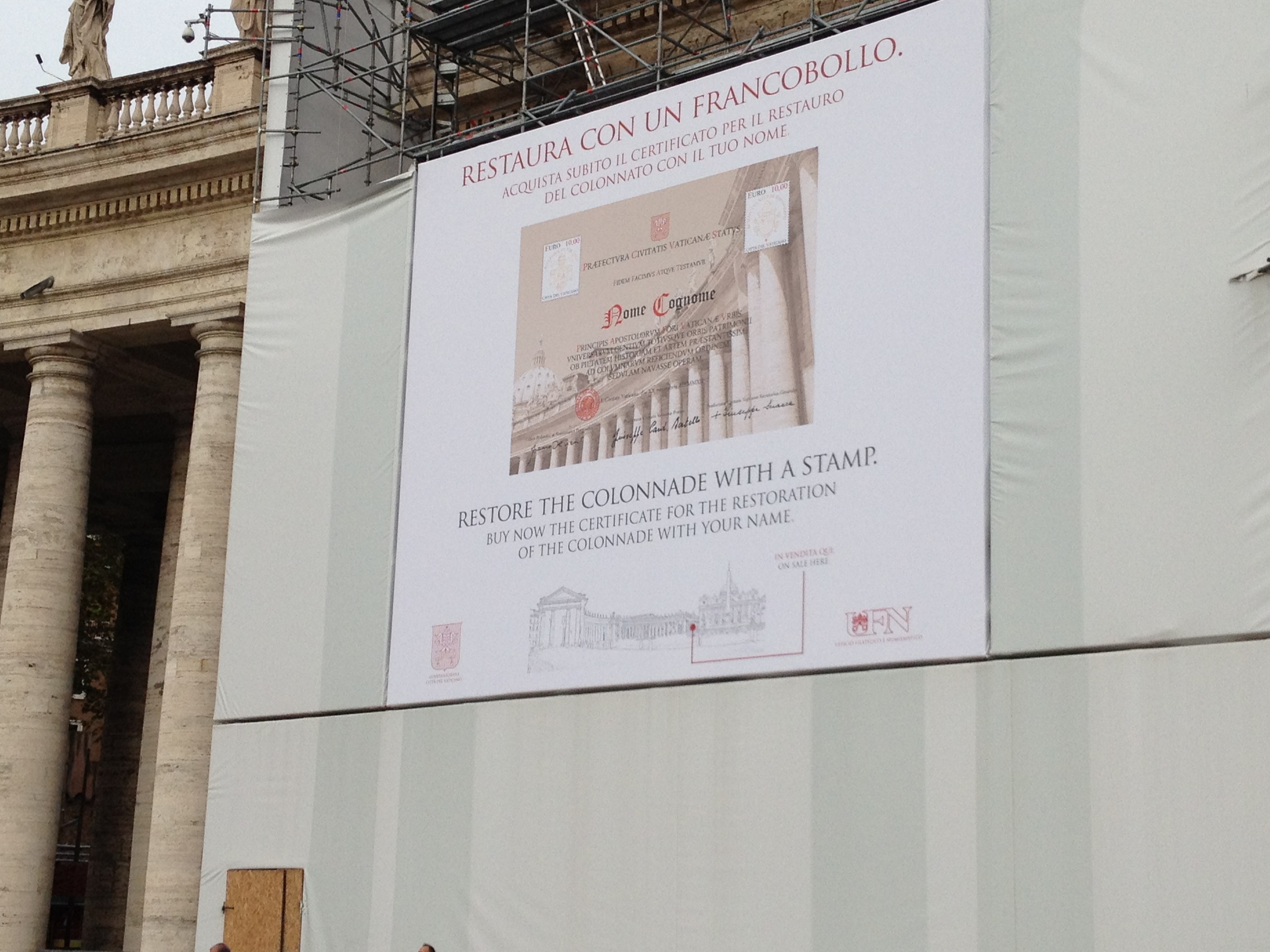 E’ iniziata la vendita del Certificato filatelico emesso il 20 novembre 2012 per il restauro del colonnato di piazza San Pietro. Per la promozione del certificato è stato fissato un manifesto informativo di 10 mt x 11 mt sui ponteggi di Piazza San Pietro.