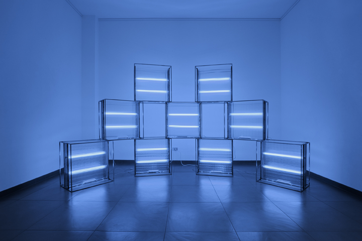vibranti di significati, sia nella proposizione di oggetti di design dalla nuda semplicità di costruzione e dalla essenzialità di forme, che costituiscono un intrigante complesso narrativo. Tutte le opere esposte maturano in una dialettica raffinata tra i materiali, una sinergia tra vetro, acciaio e legno alla quale un altro elemento tipico del designer – la luce al neon – si rapporta, indaga e staglia le parti delle opere: con delicate griglie di acciaio, ecco sottili pareti divisorie, pannelli bi e tridimensionali in vetro e specchio argentato denominati glass-wall, e lampade al neon blu intenso che dialogano con le superfici riflettenti. Tutto gestito in proporzioni dal gusto ora moderno, ora di architettura antica.