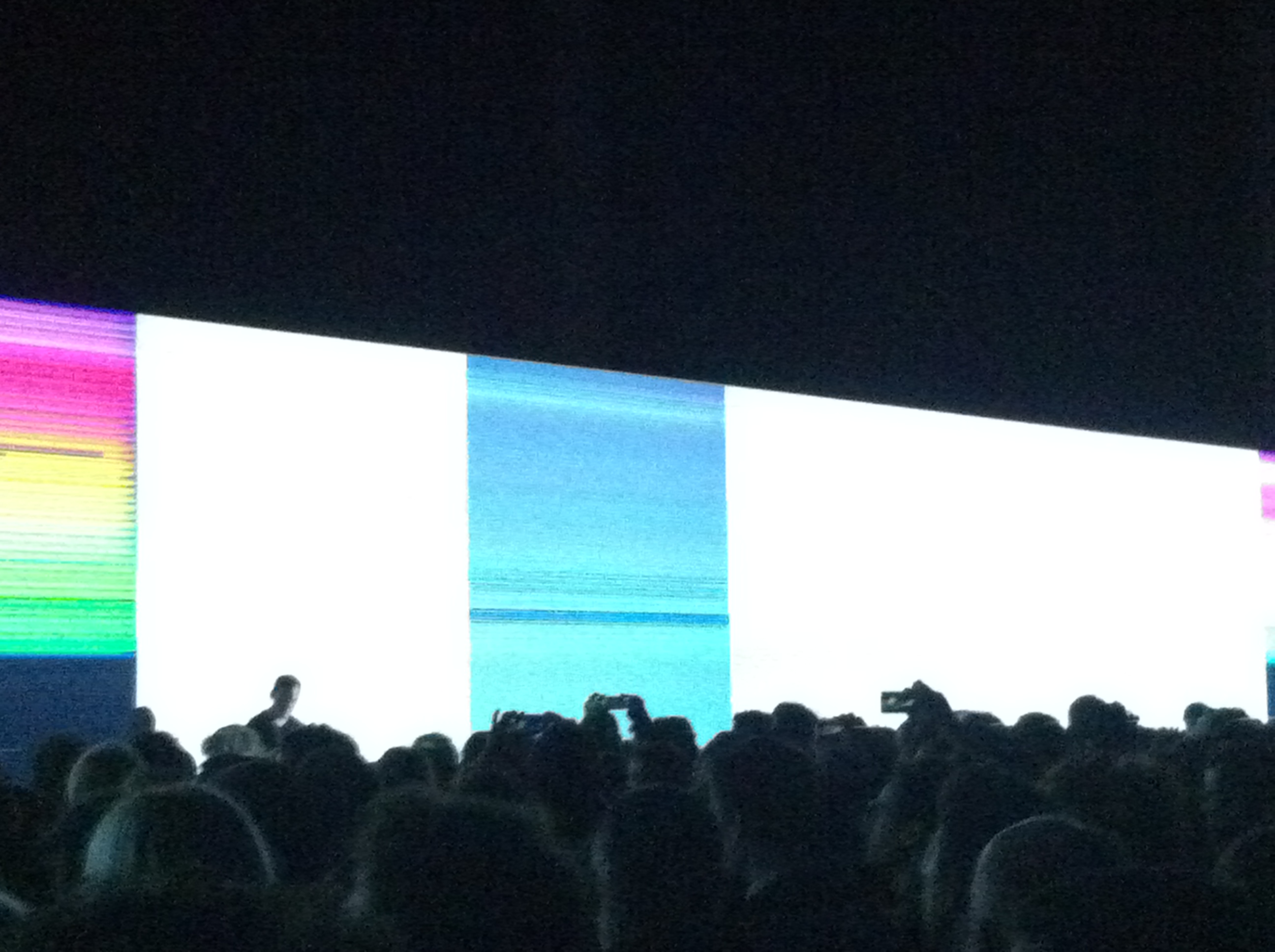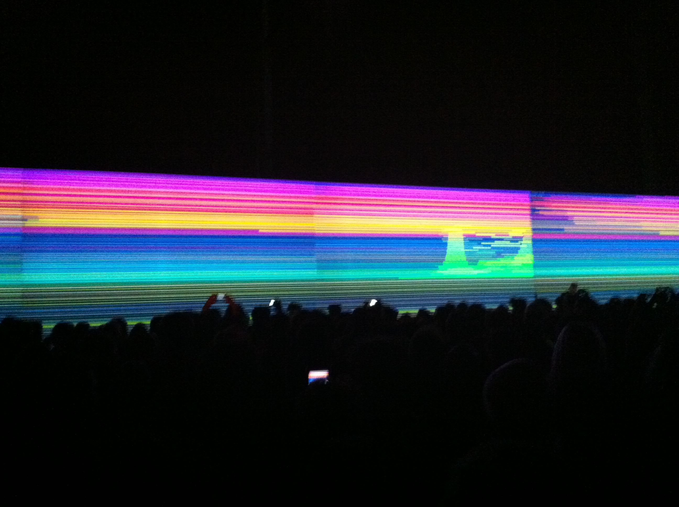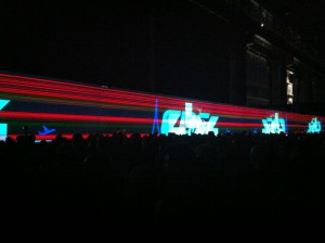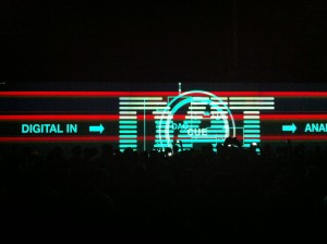 Dopo la mostra la performace. Giovedì 29 Novembre 2012 si è tenuto il live di Carsten Nicolai all’Hangar Bicocca di Milano. Un evento che ha raccolto circa 2.000 persone. Molti giovani, tanti curiosi e alcuni veri e propri fan dell’artista. Un rave legale organizzato dal curatore Andrea Lissoni, il quale ha dato vita a una mostra-concerto dall’aria internazionale, che per un’ora ci ha fatto sentire immersi in un tipico club berlinese. Nicolai, in quel tipo di club, ci è cresciuto e si è formato, diventando famoso negli anni ’90. Lo abbiamo potuto osservare mangiare al ristorante dell’Hangar, prima del live e ci è sembrato uno di noi. Fino alle 22, quando Carsten ha iniziato la sua performance davanti agli schermi della mostra “Unidisplay” (della quale avevamo scritto in questa recensione) rivolto verso il suo pubblico, trasformandosi in un individuo caduto per caso su questa terra. Un alieno che ci ha letteralmente incantato e lobotommizzato allo stesso tempo, con la sua musica minimal e le immaggini astratte proiettate in continua mutazione, elaborate con software che attribuiscono segni e colori alla scomposizione del suono. Giochi di luci e colori che si sono ripetuti all’infinito nel riflesso di due specchi disposti ai lati degli schermi. Dinnanzi, un pubblico assorto e silenzioso, quasi immobile, travolto e affascinato da quelle note che sembrano entrarti direttamente nell’anima ma senza provocare nessun tipo di emozione. Immersi nel buio, fumando sigarette. Qualcuno scalzo, qualcuno che accennava qualche timido passo di danza. Tante fotografie e video con i telefonini per immortalare un momento che Milano ricorderà volentieri.