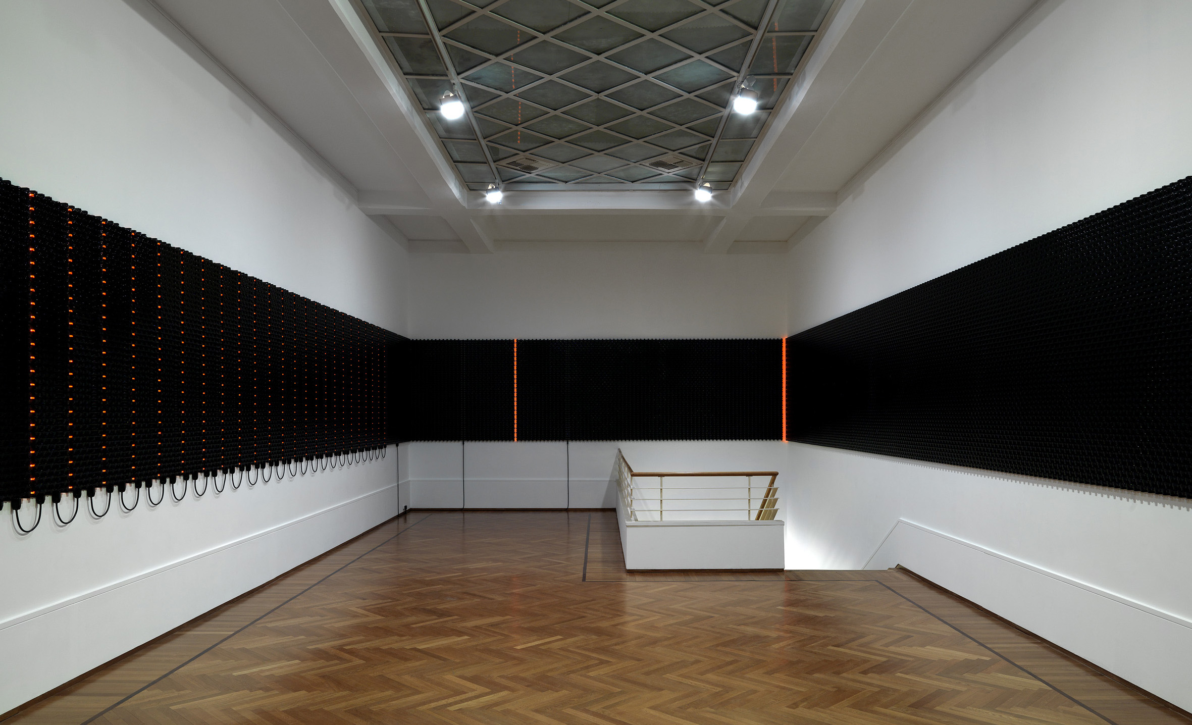 Il lavoro dell’artista israeliano Shay Frisch consiste nella creazione di campi elettrici e nella loro interazione con lo spazio circostante. Il campo è generato dall’assemblaggio di moduli, conduttori di corrente elettrica, attraverso i quali passa l’energia che si fa “forma”. Questi componenti industriali, che si trovano comunemente in commercio, mantengono all’interno una carica elettrica la cui perenne attività è rivelata da spie luminose.