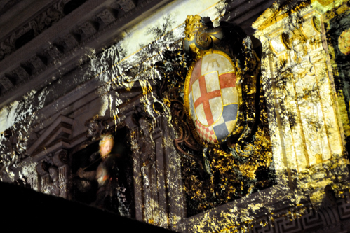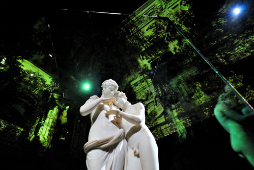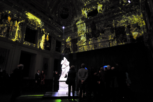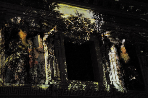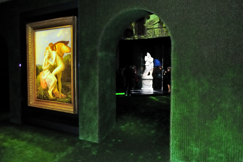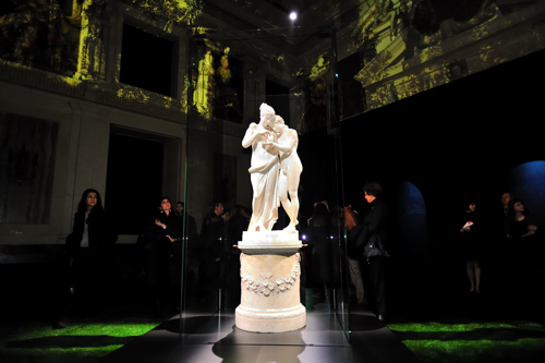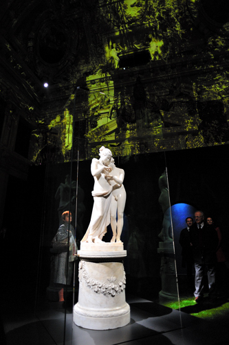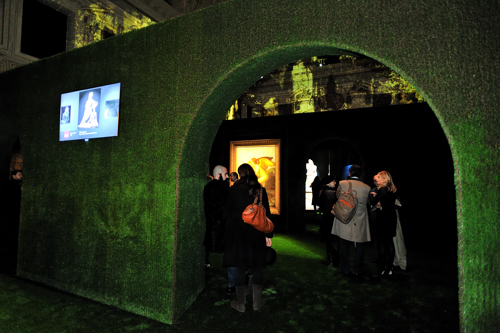 Come? Ha ricreato un giardino in perfetto stile neoclassico ispirandosi al Parco di Horta a Barcellona. Un giardino immerso nella notte dove profumi sottili e suoni ovattati accompagnano il visitatore verso le due meraviglie in mostra. Così dal pavimento un tappeto d’erba sale sulle siepi che scandiscono spazi e atmosfere differenti creando ideali stanze a cielo aperto. Un labirinto neoclassico dove gli archi posti in ordine decrescente creano fughe prospettiche che lasciano immaginare un parco infinito. Dalle siepi le ombre degli arbusti si arrampicano sulle pareti come sulle rovine disegnate da Piranesi proiettate sul soffitto. La vegetazione divora il salone cinquecentesco avvolgendo lo spettatore in uno scenario totalmente “fuori dal reale”. E via la favola. “C’era una volta una bellissima fanciulla…“