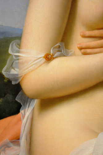 – Colta di sorpresa dall‘abbraccio di Eros, Psiche non si copre il seno come abitualmente viene rappresentato ma lo accarezza.