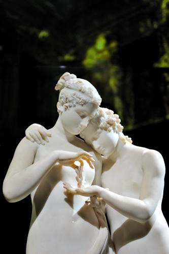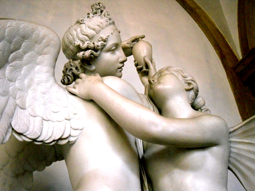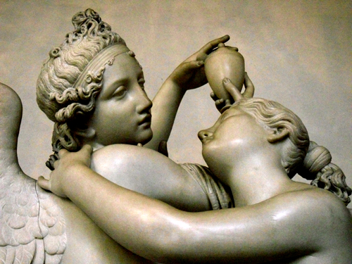 – La scultura rappresenta l’attimo in cui la pudica Psiche drappeggiata in sottile velo prende la mano di Amore per deporvi la farfalla, simbolo della propria anima (lo scambio platonico dell’anima grazie all’amore).
