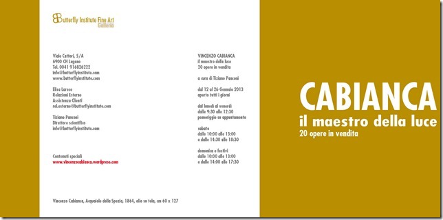 Dal 12 al 26 gennaio 2013, il Butterfly Institute Fine Art di Lugano, Svizzera, inaugura i suoi spazi completamente rinnovati proponendo una mostra monografica dedicata a Vincenzo Cabianca (1827-1902), considerato dalla critica “il più macchiaiolo dei Macchiaioli”.