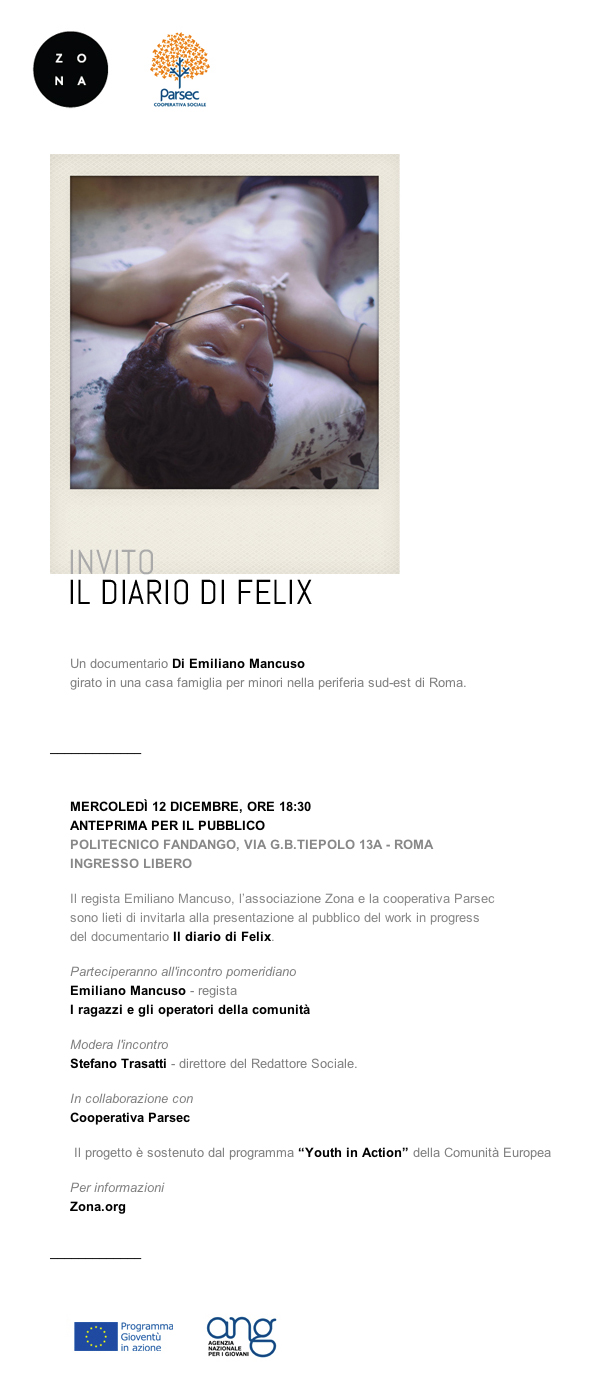 Il 12 dicembre, il fotogiornalista Emiliano Mancuso, l’associazione Zona e la cooperativa Parsec presenteranno alla stampa e al pubblico il work in progress del documentario Il diario di Felix. Il progetto è sostenuto dalla Comunità europea tramite il programma “Youth in Action”.