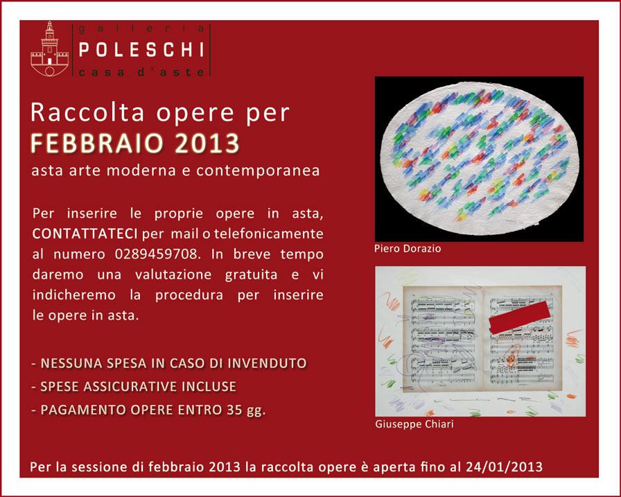 Raccolta opere per Febbraio 2013 da Poleschi per l’asta di arte moderna e contemporanea. Pe inserire le proprie opere in asta contattare lo 0289459708. Valutazione gratuita. Raccolta opere aperta fino al 24/01/2013.