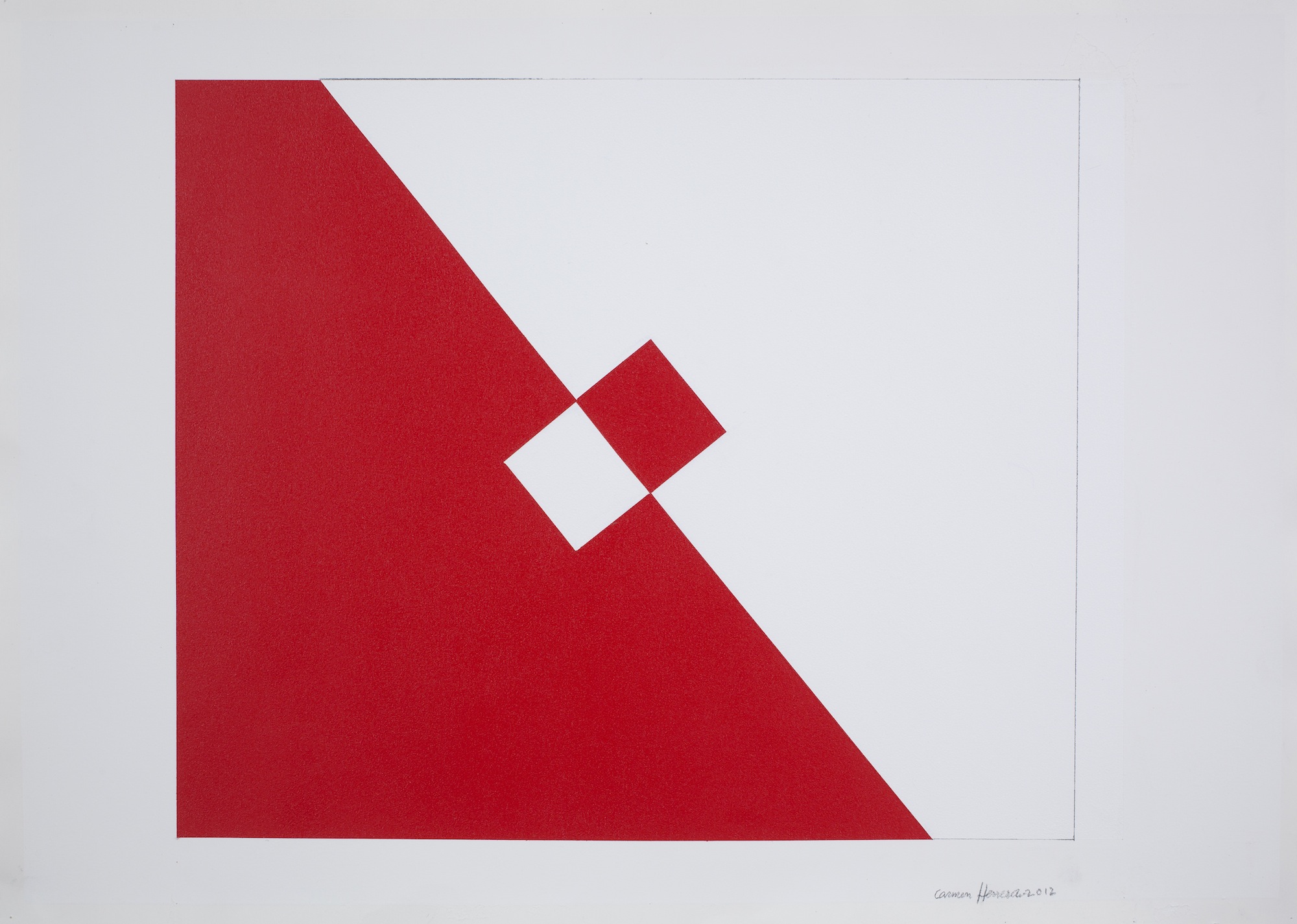 Untitled (2012) (fig.1) mostra la dimensione di specularità e di inversione suggerita da una bisettrice invisibile che crea una perfetta simmetria. Untitled (2012) appare come uno spazio solido bianco, fratturato da un vuoto nero, o spazio negativo, realizzato in gesso nero opaco a suggerire la possibilità di una terza dimensione. Come nella maggior parte del lavoro Herrera, questo vuoto, ovvero lo spazio in cui e su cui la forma si viene a trovare, può essere ricondotto agli studi di architettura fatti dall’artista a L’Avana durante il 1937-1938.