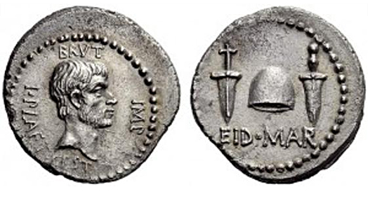 Al recto raffigura il profilo di Bruto, a capo della cospirazione e, al verso, l’indicazione Eid mar, ‘Idi di marzo’, e l’immagine di un pileo (copricapo tradizionalmente considerato simbolo di libertà) tra due pugnali, esplicito riferimento all’arma dell’assassinio. Il denaro, che nel 2008 è stato segnalato dall’opera 100 Greatest Ancient Coins al primo posto tra le cento monete più importanti dell’antichità, è l’unico conio antico a celebrare apertamente un omicidio e uno dei pochissimi menzionati da un autore classico, lo storico Cassio Dione, nella sua Storia romana.