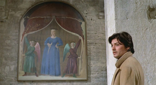 Un ciuffo setoso, una vecchia Citroen Traction Avant: Daniele Dominici (Alain Delon) nuovo supplente del liceo classico, arriva in una Rimini uggiosa, invernale. Aria da poeta maledetto, o solo da docente annoiato; barba leggermente incolta, aspetto trasandato, sigaretta tra i denti ed un frusto cappotto color cammello. Ma è il regista, Valerio Zurlini, ad “insegnare” qualcosa. Il film è La prima notte di quiete (1972), un titolo mutuato dal poeta tedesco Goethe: l’allusione è ad un verso dell’autore che si riferisce alla morte come prima notte in cui “si dorme senza sogni”. In una scena, si assiste ad una brano indiretto di critica d’arte: un’ecfrasi di Dominici\Delon su di un’opera di Piero della Francesca, la Madonna del Parto. Si tratta di un’immersione nell’opera di Piero che, dietro le apparenze di un copione cinematografico, o, a livello di fiction, di una descrizione rilassatamente amatoriale di un gitante, rivela una profondità di analisi in grado di cogliere le mezze tinte liriche dell’opera del pittore di Borgo San Sepolcro.