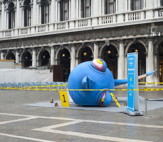 Questa mattina la città lagunare si è svegliata con una sorpresa che attraverso la rete sta facendo il giro del mondo: in Piazza San Marco, cuore dei festeggiamenti del Carnevale di Venezia – il più famoso dopo quello di Rio – non si può non notare un’opera di sei metri di lunghezza per quattro di larghezza, ispirata all’uccellino blu più famoso del mondo: Twitter.
