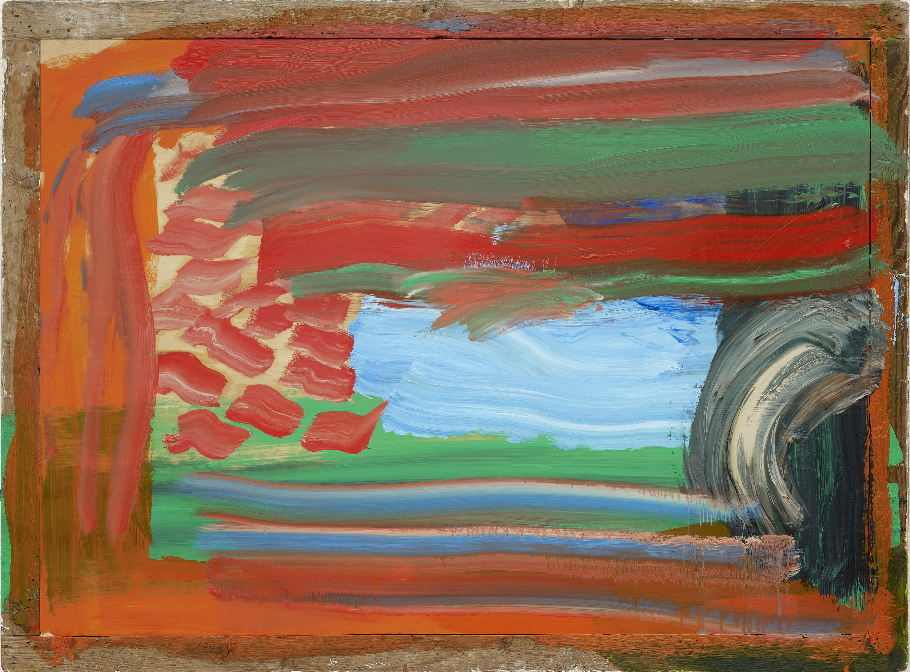 In ogni dipinto di Hodgkin, la presenza del soggetto, percepita ma non definita, pone resistenza all’ interpretazione, rimanendo allusiva e frammentaria. Tramite i titoli delle opere, l’artista dà un nome alle tracce vibranti delle sue esperienze, ispirate da memorie, luoghi, e conoscenze della vita quotidiana; basti pensare alla sensuale Red Sky at Night (2001-11) e al suo inverso arioso Seaside (2011-12); le tonalità golose di Toffee (2012); le abbaglianti cromie contrastanti di Red Flowers (2011-12); le cupe pennellate di Dark Cloud (2009-11). Accennando al mondo oltre i confini della cornice, Hodgkin crea opere che sono al contempo strutturate, entità autonome, e sineddoche della più ampia realtà estetica che giace sottesa al di là dei loro limiti.