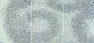 Ne nasce un percorso interessante in cui spiccano le tipiche teste con i relativi pensieri, i corpi in costante movimento e le forme stilizzate composte da elementi geometrici che si ripetono e si intrecciano in composizioni molto fitte.