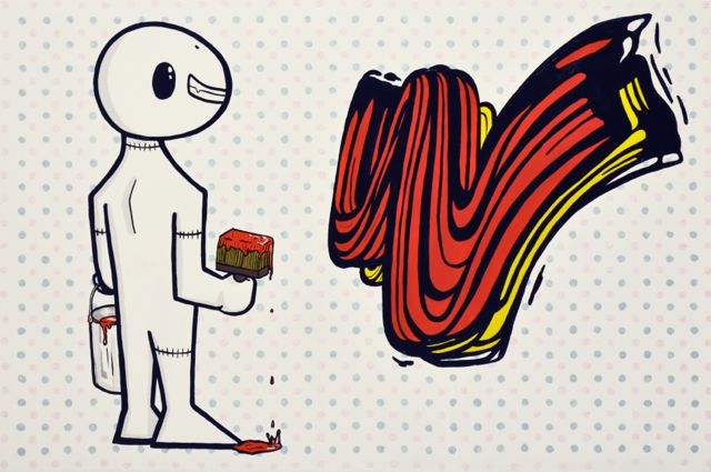 Teppista fino al midollo utilizza i tanto amati Campbell’s Soup Warholiani per i propri bisogni, una vera operazione da pop Piero Manzoni. Il birbante Sfiggy spezza i cuori delle donzelle cartoon di Lichtenstein, minaccia con una pistola i figurini colorati di Haring e urla disperato sotti i cieli espressionisti di Munch, si incorona e fa arrabbiare un Basquiat. Bullo da periferia, Sfiggy è un qualunque, è tutti e ognuno, anonimo ma presente, un po’ bad boy, si diverte a intrufolarsi nella storia dell’arte e stravolgere i piani.