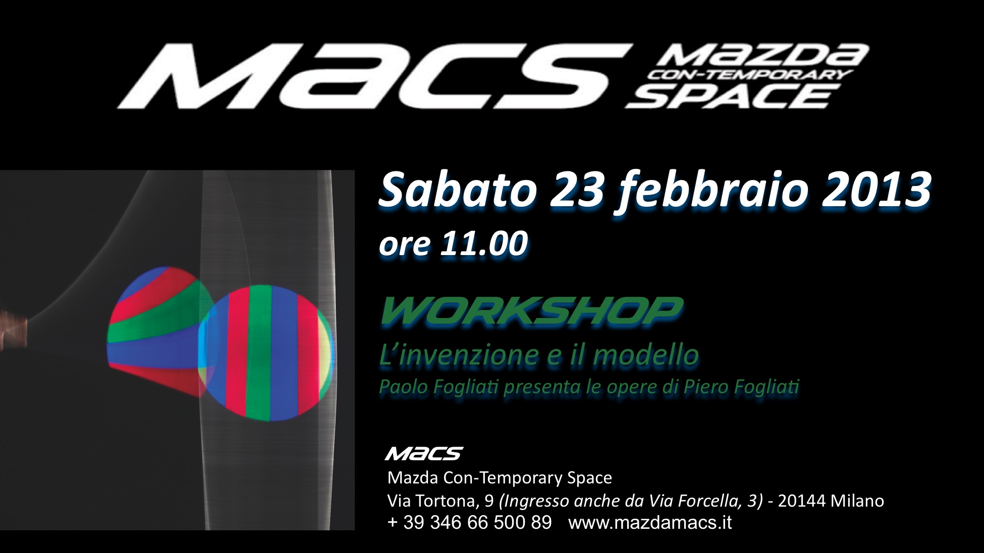 Sabato 23 febbraio alle ore 11 al “MACS Mazda Con-Temporary Space” Paolo Fogliati presenta le opere di Piero Fogliati in un il workshop dal titolo “L’invenzione e il modello”.