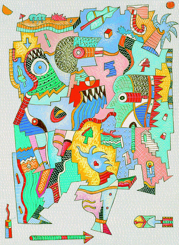 Pino Chimenti è reduce dalla partecipazione al Padiglione Italiano della Biennale di Venezia del 2011, segnalato al curatore Vittorio Sgarbi dal noto critico d’arte Gillo Dorfles, che, nel 1985, lo aveva già selezionato per apparire tra gli artisti scelti dalla critica nel prestigioso Catalogo dell’Arte Italiana edito da Mondadori. Dopo aver frequentato l’Accademia di Belle Arti di Urbino, sotto la guida del pittore Concetto Pozzati, Chimenti partecipa a numerose mostre personali e collettive in Italia e all’estero. A partire dalla seconda metà degli anni ’70, dopo un breve periodo di ricerca concettuale, la sua pittura acquista maggiore libertà compositiva, avvicinandosi alla personalissima figurazione astratto-fantastica che contraddistingue ancora oggi il suo lavoro, mai incline a seguire mode e correnti e caratterizzato da un’inconfondibile atmosfera fiabesca pervasa da una sottile ironia. «Ormai da diversi anni – ha scritto Dorfles dell’artista – prosegue nell’invenzione costante di piccoli miti personali, di strane leggende, nelle quali dei personaggi – tra il surreale e il ludico, tra il grottesco e l’affabile – si trastullano in mezzo a ghirlande di forme variopinte, di marezzature cromatiche, di sottili estroflessioni magnetiche, sempre sostenute da un minuzioso grafismo». Proprio quei miti personali e quei personaggi ludici e surreali sono i protagonisti della mostra del MACA, che li declina attraverso una collezione di circa 50 opere pittoriche, in cui il curatore Boris Brollo intravede un’affinità di spirito che lega l’artista calabrese a Picasso. «Non è una questione di forma o di segno, ma di concetto. Egli traduce l’opposizione di Picasso al regime franchista in una opposizione tout court – scrive Brollo –. Egli è un moderno maestro del racconto di questa terra calabra appartenuta a una grande storia e le cui radici trasudano ancora di questo passato glorioso. Pure qui egli sviluppa un senso del fantasticare che, benché affondi le radici nel passato, guarda al futuro. Futuro in cui il concetto dell’eterna lotta umana, oggi rimandata al virtuale, al computer e alle bombe intelligenti, segna un punto ancora umano alla lotta a corpo a corpo».