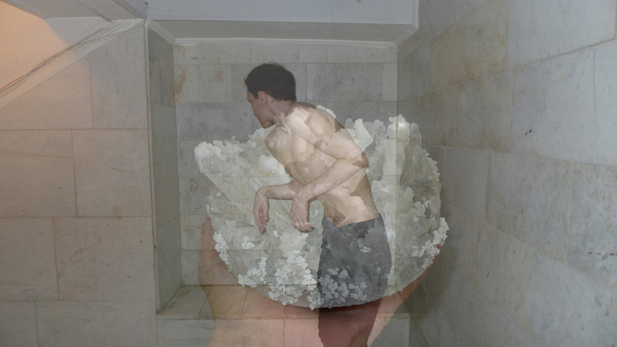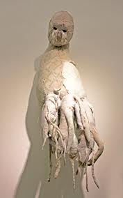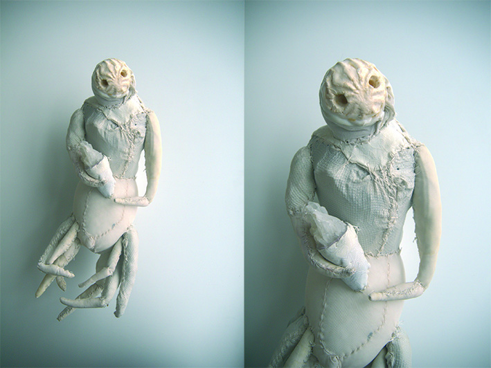 E’ permesso entrare nelle sale della mostra solo con dei copriscarpe distribuiti all’ingresso. Come per accedere in un reparto di rianimazione, anche se in questo caso sembra di entrare più in un reparto psichiatrico. Tutto è asettico. E’ tutto bianco. Nella prima stanza i pupazzi cuciti a mano dallo stesso Antufiev, quasi neanche si notano. Sono bianchi anche loro, anche se di puro non sembrano avere proprio nulla. Sono mostri con denti veri, quattro braccia, otto gambe. Ossa, scheletri, delfini, stoffa, tanta stoffa. Cristalli, meteoriti, capelli, colla, pelle di serpenti, insetti, marmo, legno. E questa lista è comunque quasi più corta del titolo della mostra “Twelve, wood, dolphin, knife, bowl, mask, crystal, bones and marble – fusion. Exploring materials”.