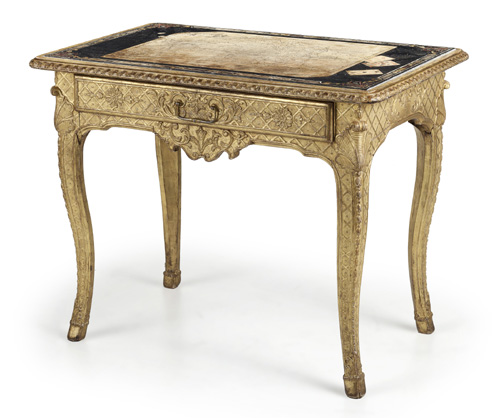 Di grande piacevolezza estetica ancorché storica è il tavolo in legno intagliato e dorato francese della prima metà del XVIII secolo, con piano in scagliola a fondo nero con disegno centrale raffigurante L’Asie Divisee selon l’Etendue de ses Principales Parties, che si ispira ad una celebre mappa del cartografo ed incisore francese Nicolas de Fer (1646 – 1720) raccolta in «Géographe ordinaire de sa Majesté Catholique» (1720).