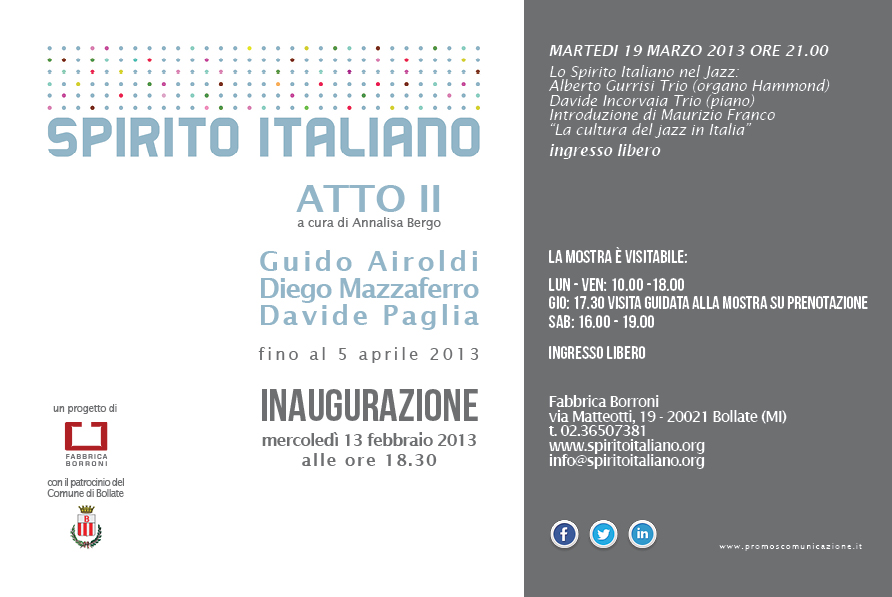 Sullo sfondo delle esplosive opere di Spirito Italiano – ATTO II, Fabbrica Borroni invita all’incontro LO SPIRITO ITALIANO NEL JAZZ: conferenza di Maurizio Franco “Le nuove leve del jazz italiano” e a seguire concerto di Alberto Gurrisi Trio (organo Hammond) e Davide Incorvaia Trio (piano).