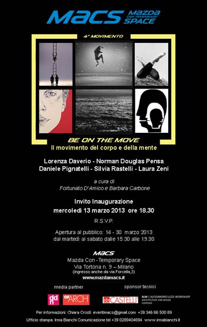 Mercoledì 13 marzo alle ore 18.30 inaugura presso il “MACS Mazda Con-Temporary Space” la mostra Be on the move. Il movimento del corpo e della mente – Quarto movimento all’interno dell’evento “Il movimento delle arti”, prodotto da Mazda, a cura di Fortunato D’Amico e Barbara Carbone.