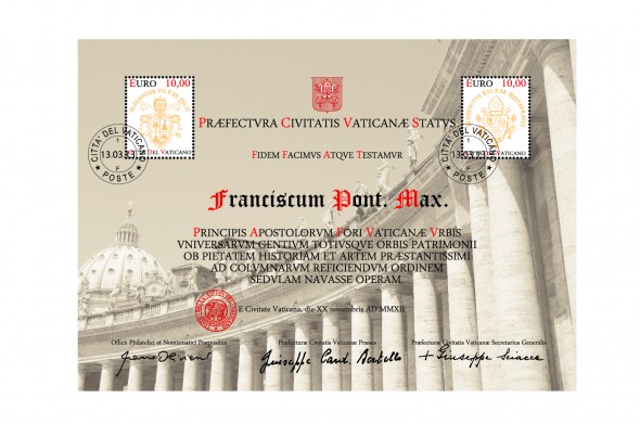 L’Ufficio Filatelico e Numismatico ha dedicato un Certificato Filatelico per il Restauro del Colonnato di Piazza San Pietro al nuovo Papa Sua Santità FRANCESCO, eletto il 13 Marzo 2013. Il Certificato Filatelico sarà obliterato con l’annullo di Inizio Pontificato. Il Certificato Filatelico da domani sarà in vendita presso l’Ufficio Filatelico e Numismatico Vaticano.