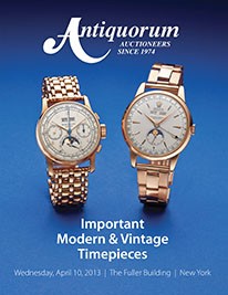 Antiquorum Auctioneers,prima casa d’asta al mondo per gli orologi moderni e d’epoca, presenta l’attesissima asta che si terrà il 10 aprile 2013 “Importanti orologi moderni e d’epoca” presso il loro quartier generale degli Stati Uniti sulla Madison Avenue a New York City. L’asta di primavera offrirà ai collezionisti una straordinaria selezione di orologi rari e unici tra cui una collezione di orologi Patek Philippe e Rolex evidenziato dalla Patek Philippe Ref.. 1518 in oro rosa. Le anteprime si terranno nelle città di tutto il mondo, tra cui Hong Kong, Singapore, Shanghai, Pechino e New York.
