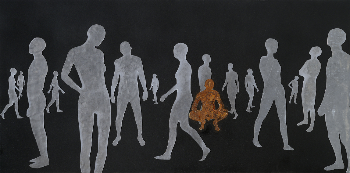 Come ogni artista che possa essere definito tale, Fabrizio Pozzoli, indaga il presente immaginando il futuro, presentando un nuovo ciclo di lavori in cui la figura umana pur mantenendo il ruolo di protagonista, entra in relazione con molteplici materiali e con altrettanti e significativi elementi simbolici. Il filo di ferro nella sua purezza ed autenticità diviene forma umana, modificando se stesso e in alcuni casi, proprio come avviene per l’uomo, con il passare del tempo e anche a causa dell’ambiente nel quale vive, si trasforma ed invecchia, ossida ed arrugginisce. Il concetto di “casa” e quello di “trave”, divengono metafore di spazio vitale, icone e allegorie di luogo – rifugio, che restituisce un’apparente certezza, ma che in realtà rischia di divenire la roccaforte dove rinchiudersi, allontanandosi dal reale e dall’interazione con il prossimo.