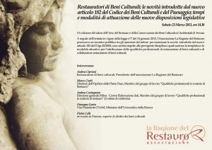 A seguito dell’entrata in vigore della legge n. 7 del 14 gennaio 2013, l’Associazione “La Ragione del Restauro” promuove un incontro pubblico tra gli operatori del settore per esaminare le novità introdotte dal nuovo articolo 182 del D. Lgs 42/2004: cosa cambia rispetto alla previgente disciplina, e quali saranno la tempistica e le modalità attuative per l’attribuzione delle qualifiche professionali di restauratore di beni culturali e di collaboratore restauratore di beni culturali.