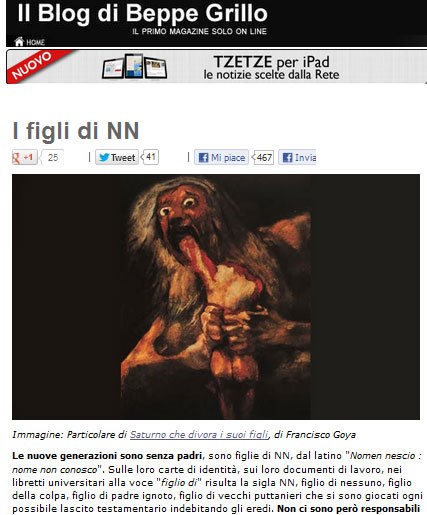 Sul blog di Beppe Grillo è comparso un capolavoro. Non si tratta di qualche pillola di saggezza o frase “illuminante” ma di un vero capolavoro: “Saturno che divora i suoi figli”. Un particolare del dipinto che Grillo ha usato per scrivere un nuovo post. Manie di onnipotenza o rabbia sempre più imperante? Forse la seconda, dato che le ultime parole del leader del Movimento Cinque Stelle sono state “In Parlamento siete tutti puttanieri. Bersani come Berlusconi e D’Alema, li cacceremo.”