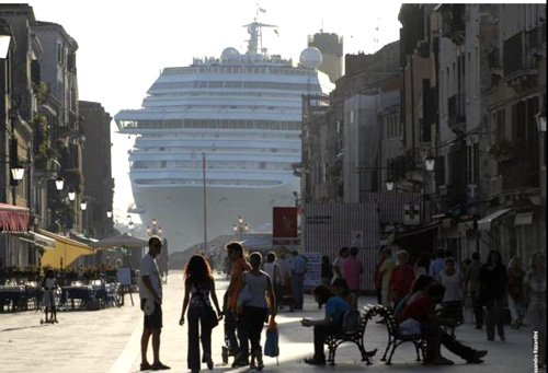 Inizia la primavera e riprende la stagione delle crociere. Riparte l’assalto a Venezia. Puntuali come ogni anno tornano a scorrazzare per il Canale della Giudecca i mastodontici divertifici galleggianti. Hanno nomi stuzzicanti e seducenti, quasi sensuali. Si chiamano Divina, Fascinosa, Fantasia, Magnifica ma non sono altro che enormi mostri di mare tipo Kraken o Leviatano. Sono immensi, smisurati, sproporzionati: 60 metri d’altezza (15 è la media degli edifici della città), 50 di larghezza e 333 di lunghezza (la più grande), due volte Piazza San Marco, quattro volte Palazzo Ducale. 140 mila tonnellate di “puro sballo” distribuito tra piscine, casinò, discoteche, Spa, cinema e sala giochi. Più l’imperdibile terrazzo panoramico all’aperto dove poter guardare dall’alto verso il basso il plastico della città. Venezia in formaldeide.